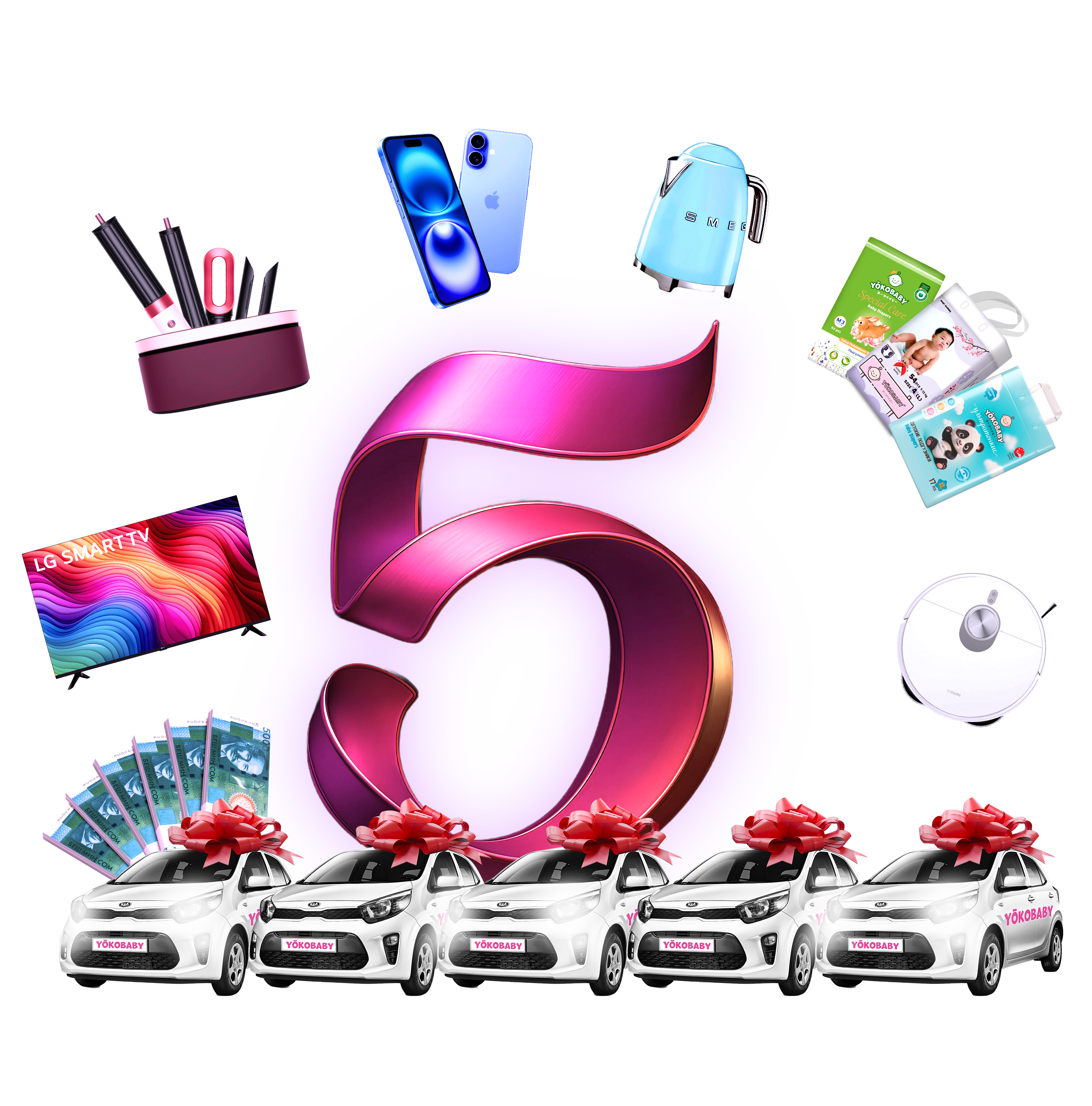 Каждый месяц мы разыгрываем множество ценных призов, среди которых: ● 5 автомобилей Kia Morning ● 5 Стайлеров «Dyson Airwrap Long» ● 5 Телевизоров LG 50 LED ● 5 Мобильных устройств «Apple iPhone 16 Pro Max» ● 5 Робот-пылесосов Xiaomi ● 5 Чайников SMEG ● 25 Денежных призов на 10 000 сом ● 50 Cертификатов на покупку в сети «Bimar» ● 50 Годовых Запасов подгузников YOKOBABY ● 500 Месячных запасов продукции YOKOBABY